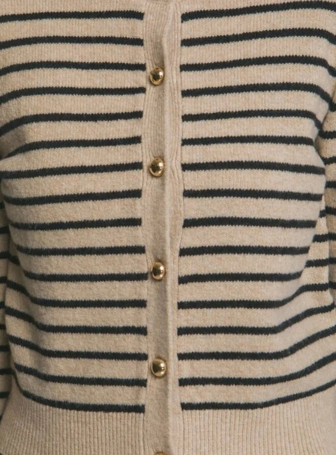 Cardigan de punto con diseño a rayas, ideal para un look sofisticado y versátil. Su confección en tejido suave y abrigado brinda comodidad, mientras que sus botones con detalle de perlas añaden un toque elegante. Producto importado, Estilo clásico y atemporal, Tejido suave y confortable. Perfecto para combinar con jeans, pantalones de vestir o faldas, adaptándose a cualquier ocasión.